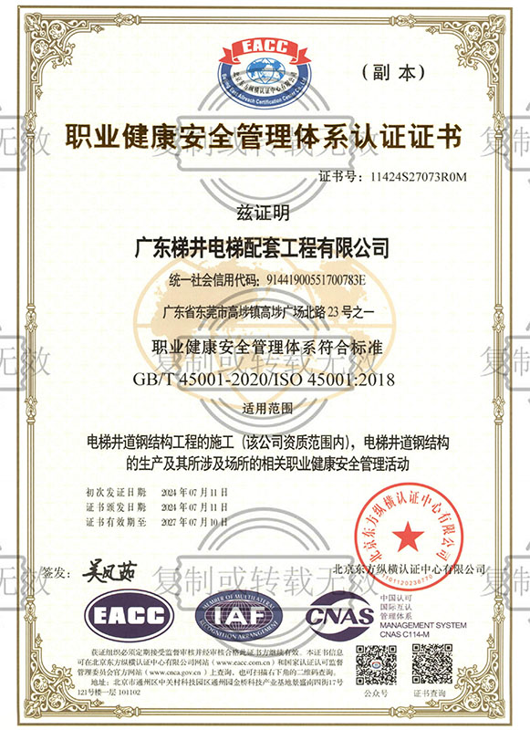 职业健康安全管理体系认证证书